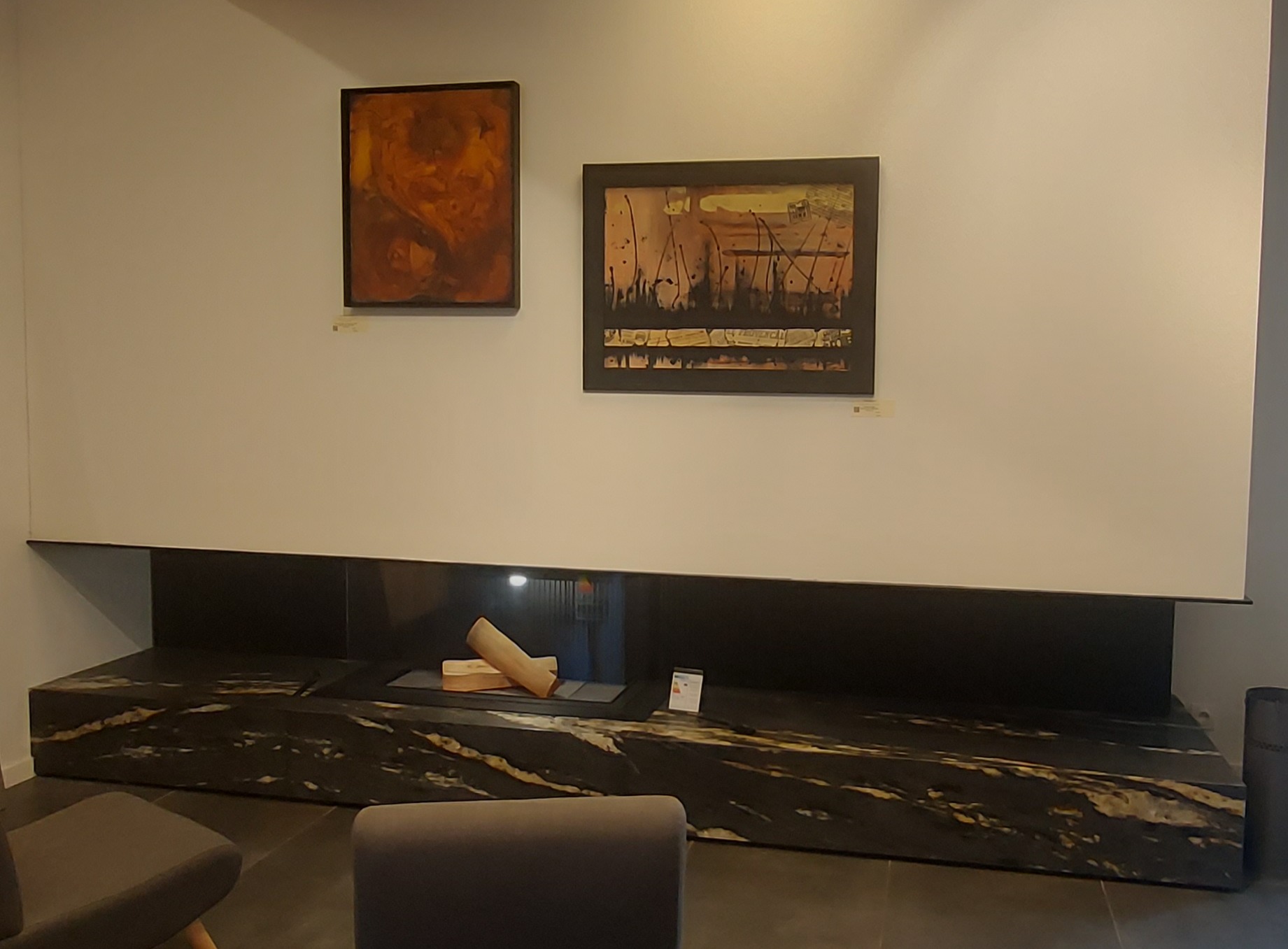 Les teintes chaudes des foyers soulignent la vibrance des couleurs des œuvres.